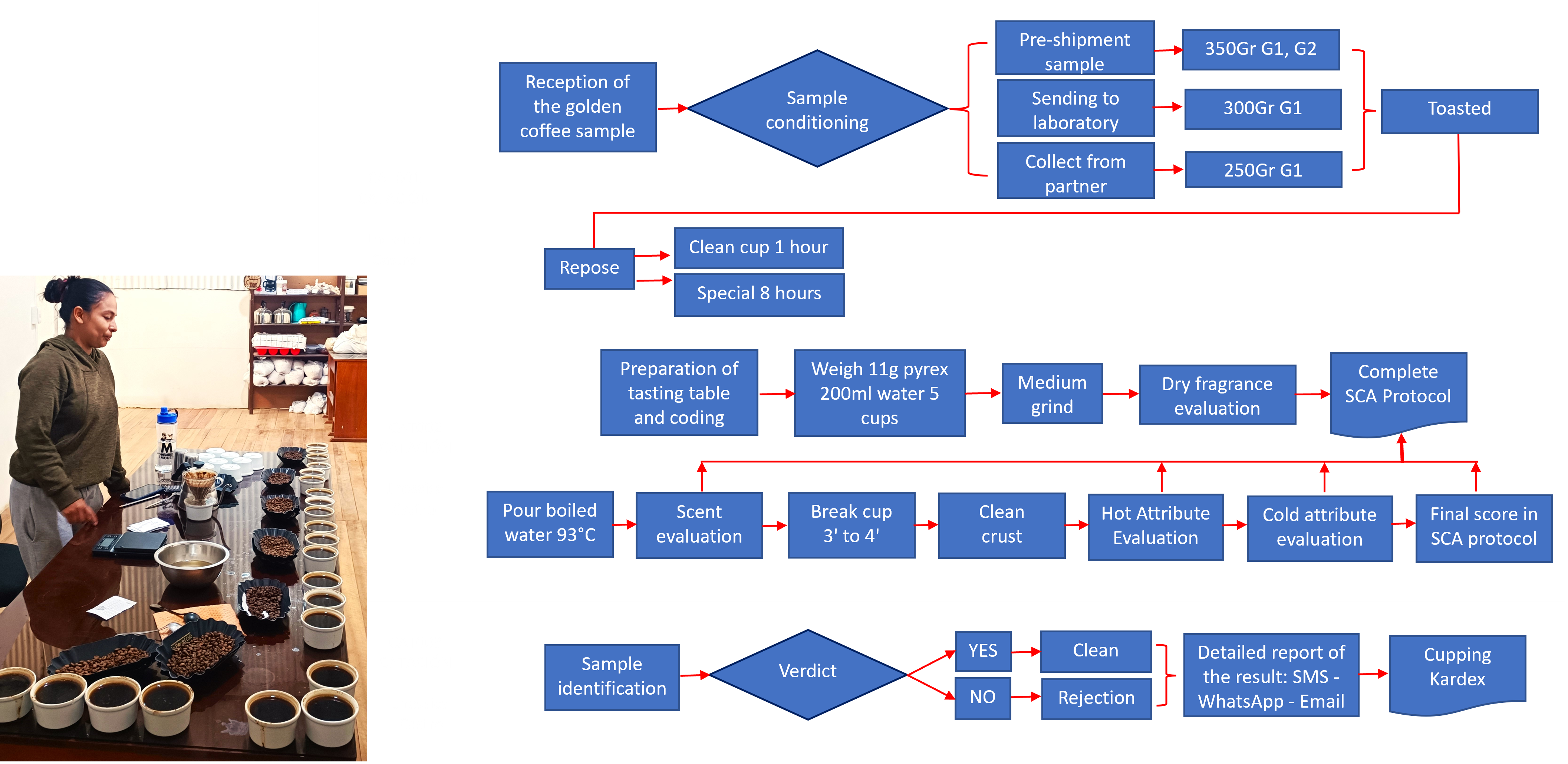 El proceso comienza con la recepción de la muestra de café verde. Esta muestra se prepara para ser evaluada y se acondiciona adecuadamente para el proceso de catación.